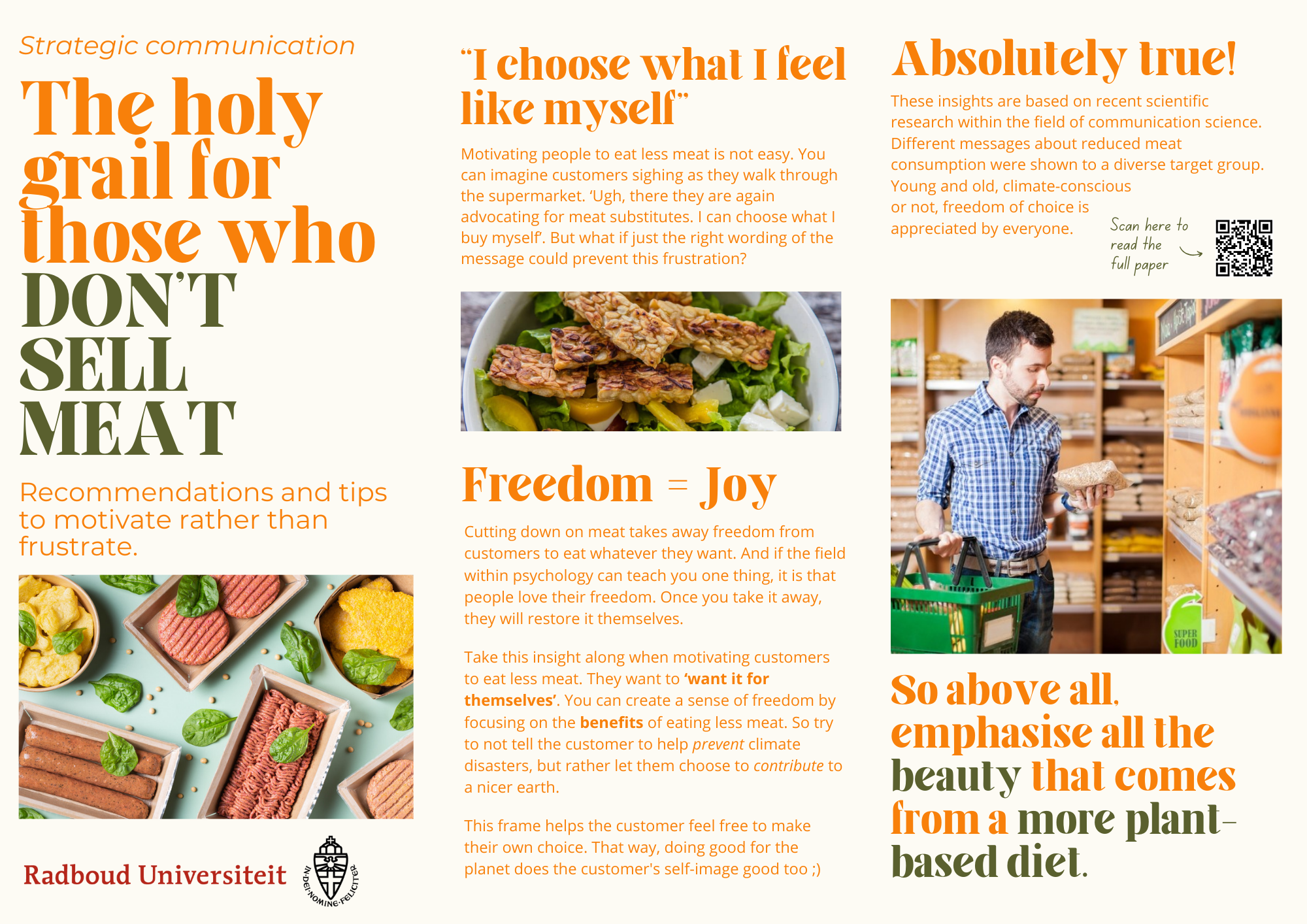 My interest for pro-environmental communication, and specifically backlash effects, started here. Wrapping up my bachelor’s Psychology and Master’s communication science, I applied the knowledge of both fiels to the protein transition. The main question: How can we minimize backlash to meat reduction messages? This study provides valuable insights into reactance-preventing communication strategies that set the tone for the PhD journey that had yet to come.